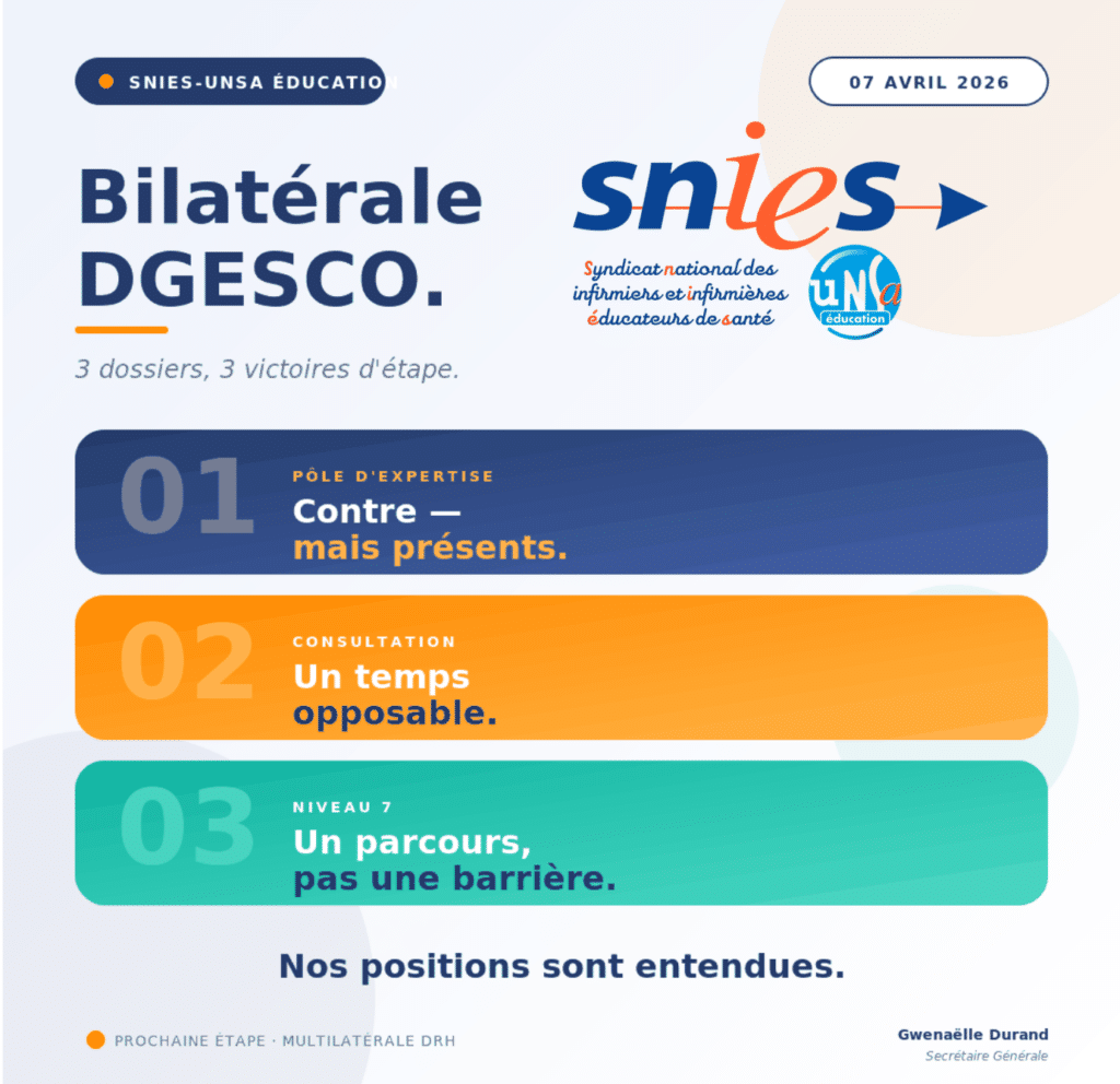 Pôle d’expertise, consultation infirmière, accès au niveau 7. Le SNIES-UNSA Éducation a été reçu en bilatérale par la DGESCO. Retour détaillé sur une audience dense, où notre ligne réformiste — argumentée, exigeante, force de proposition — a pesé sur chacun des dossiers.